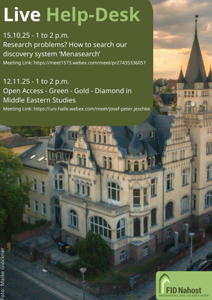 Um unsere Fachcommunity noch besser unterstützen zu können, laden wir Sie zu unserem neuen Veranstaltungsformat „Live Help Desk” ein. Während dieser Sprechstunden haben Sie die Möglichkeit, uns alle Ihre Fragen zum jeweiligen Thema zu stellen. Es ist dabei unerheblich, ob Sie gerade erst in die wissenschaftliche Recherche in unserem Discovery-System oder das Thema „Open Access” einsteigen wollen oder bereits Experte in diesen Bereichen sind. Gibt es einen Themenbereich, den wir in unserer nächsten Sprechstunde vorbereiten sollen? Dann lassen Sie es uns unter menalib@bibliothek.uni-halle.de wissen. Wir freuen uns auf Sie!