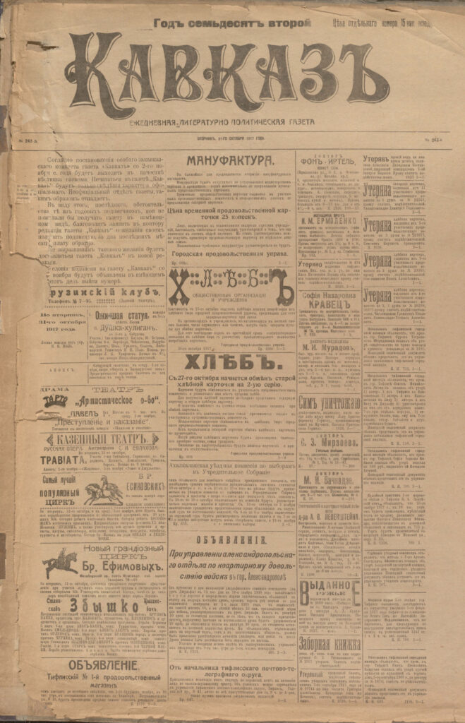 Die Zeitung Kavkaz (Kaukasus) erschien in den Jahren 1846-1918. Sie war die erste russischsprachige Zeitung im Kaukasus. Sie wurde in Tiflis (Georgien) herausgegeben. Alle Ausgaben können im Volltext durchsucht werden. Einzelne Seiten können im Originallayout als PDF heruntergeladen werden. Das Angebot ist deutschlandweit und an deutschen Auslandsinstituten über das System der Nationallizenzen kostenfrei zugänglich.